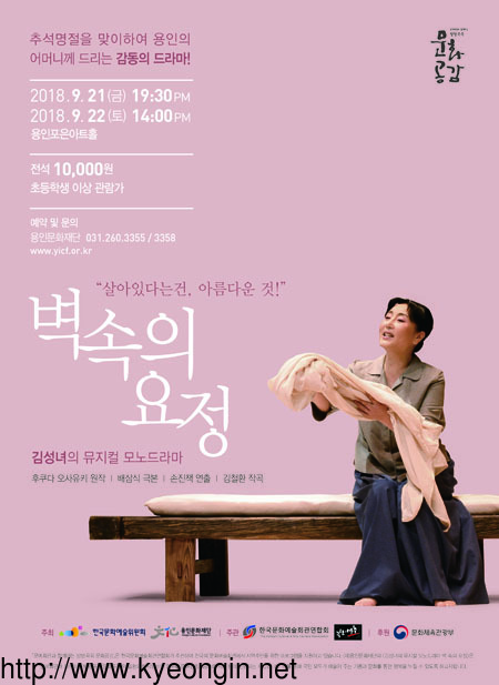 (재)용인문화재단(이사장 백군기)은 2018년 추석을 맞이하여 김성녀의 뮤지컬 모노 드라마 <벽 속의 요정>을 다음달 21일과 22일, 양일간에 걸쳐 용인포은아트홀에서 진행한다.