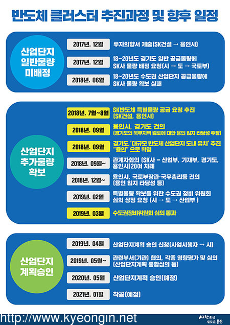 이날 국토교통부 수도권정비위원회는 최종 심의를 거쳐 반도체 클러스터 조성을 위한 용인시의 산업단지 추가물량을 승인했다. 이는 문재인 정부의 첫 수도권 규제완화사례로 클러스터 조성이 국가적으로 꼭 필요하다는 판단에 따른 것이다.