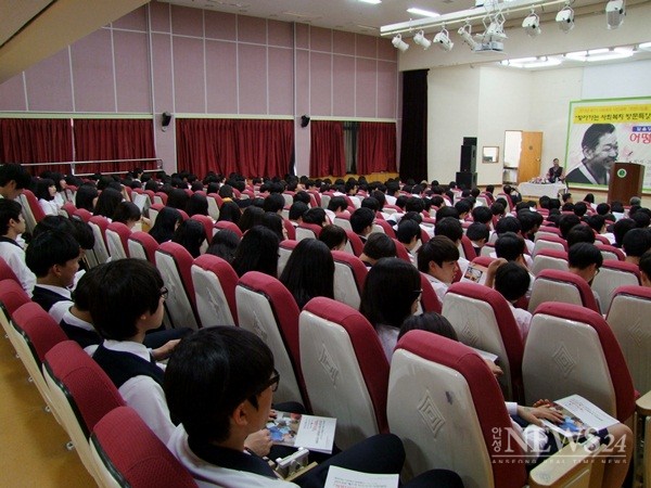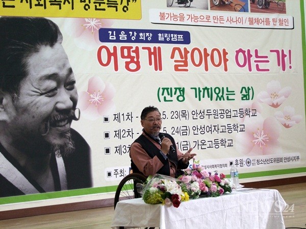 초청 강사는 불가능을 가능으로 만든 하반신마비 장애인으로 한국최초 유일하게 철인 3종 경기에 출전 8회를 완주하고, 500원짜리 커피판매의 수익으로 심장병어린이, 소년소녀가장, 독거어르신, 저소득 장애인을 돕는 활동을 하고 있으며, 또, 세계 3대 빈민지역의 하나인 필리핀 바세코 지역의 아동들에게 공부와 급식 등을 지속적으로 지원하고 있는 한국장애인복지신문 경기본부장 / 대한장애인사이클연맹 이사 /국제구호단체 월드 원 대표인 김음강 회장을 초청해 ‘어떻게 살아야 하는가 - 진정 가치 있는 삶’ 이라는 주제로 강연을 펼쳐 청소년들로 부터 공감과 큰 호평을 받았다,