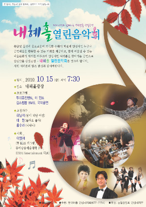 이에 힘입어 이번 음악회는 KBS 개그맨 이영재의 진행으로 지역 주민들과 함께한다. 이날 초청가수로 하남석, 태현, 홍수라와 뿌리퓨전밴드, 더윈드 등 다양한 공연팀이 출연할 예정이다.