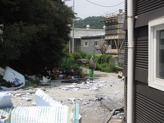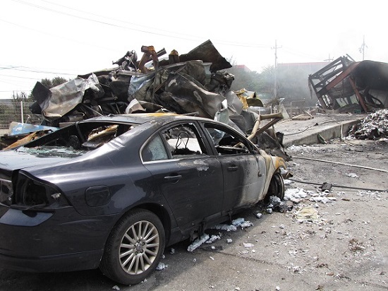 공장입구에는 반쯤 불타버린 외제차가 서 있었는데, 폐건축물과 뒤섞여 있어서 원래 버려진 것인지 화재로 인해 망가진 것인지 분간하기 어려웠다. 다만 뒤에 번호판만은 선명한 흰색 바탕을 유지하고 있어 화재로 인한 피해 중 하나로 유추할 수 있을 뿐이었다.