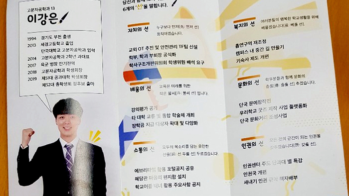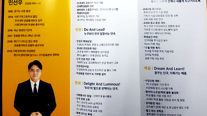 ![]() ▲ 단국대학교 '선' 선거운동본부 총학생회 선거 팜플렛 (사진=김정호 대학생 논설위원) © 경인신문 |