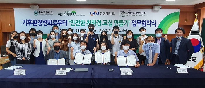 [용인일보 최철호 기자] 초록우산어린이재단 경기아동옹호센터(소장 김승현)는 26일 오후 2시 30분, 안산 송호고등학교에서 송호고등학교(교장 황교선), 인천대학교 환경융합기술연구원(원장 이희관), 자연의벗연구소(이사장 오창길)와 함께 기후환경변화로부터 안전한 친환경 교실 구축을 위한 업무협약 체결 및 발대식을 개최했다고 밝혔다. 행사는 발열체크, 마스크 착용, 거리두기 등 코로나19 방역수칙을 엄격히 준수한 가운데 안전하게 진행됐다.