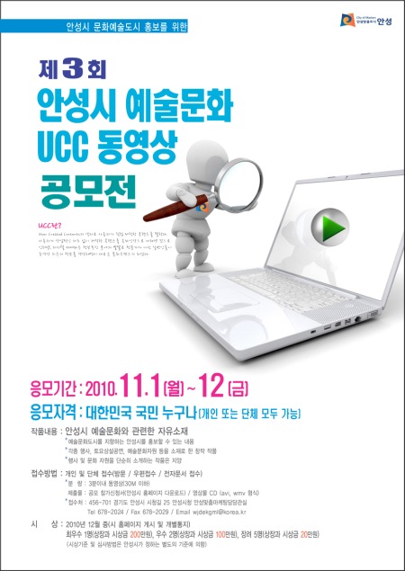안성시는 지난 8월에 공고한 안성시 문화예술도시 홍보를 위한 ‘UCC 동영상 공모전’을 11월 12일까지 접수한다고 밝혔다.