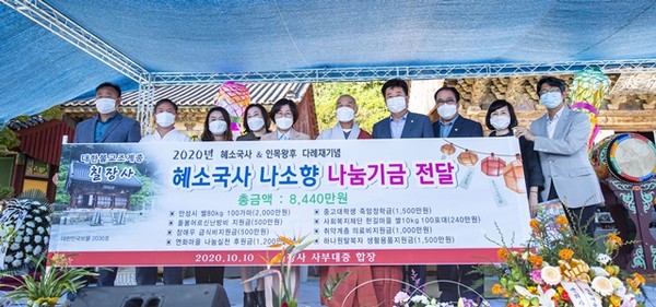 또한 이날 다례재는 국보사찰 칠장사가 지속적으로 펼쳐온 ‘나누고 소통하여 향기로운 세상을 만들어 가자’는 천년대선사 혜소국사의 나눔 실천에 역점을 두고 총 8440만원에 달하는 성금을 회향했다.